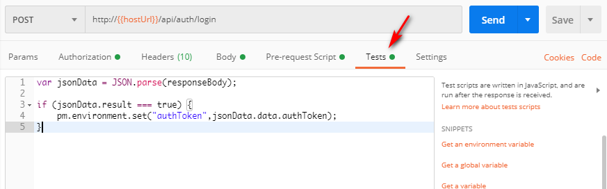 먼저 사용할 요청에서 Tests 탭을 선택하고 아래와 같이 넣어 줍니다.